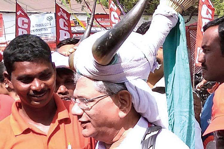 তেলুগু আদিবাসীর বেশে ইয়েচুরি। শনিবার হায়দরাবাদে।