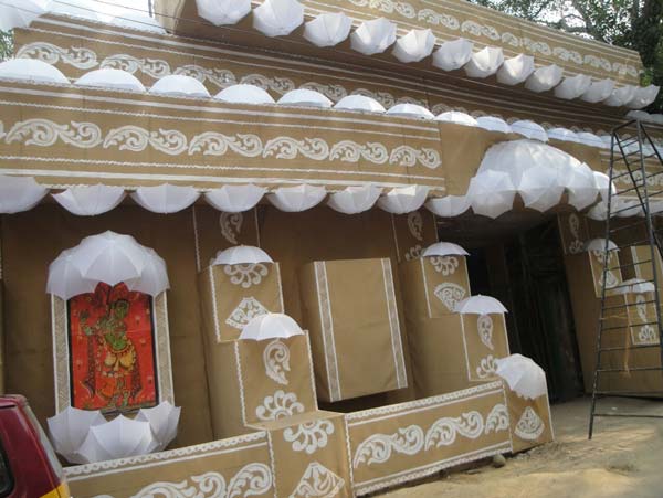 করোলবাগের পুজোয় সাদা ছাতা দিয়ে মণ্ডপ।