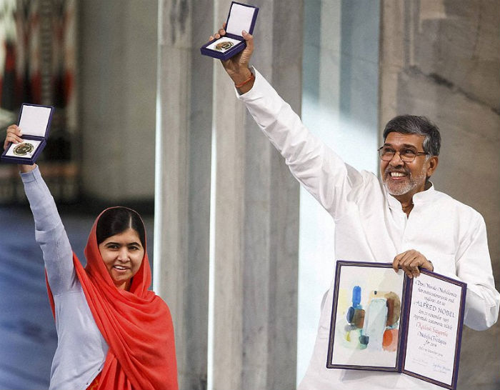 মালালার সঙ্গে নোবেল প্রাপ্তির দিনে কৈলাস সত্যার্থী। —ফাইল চিত্র।