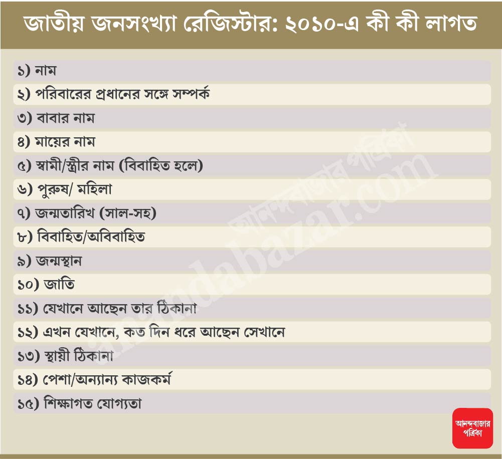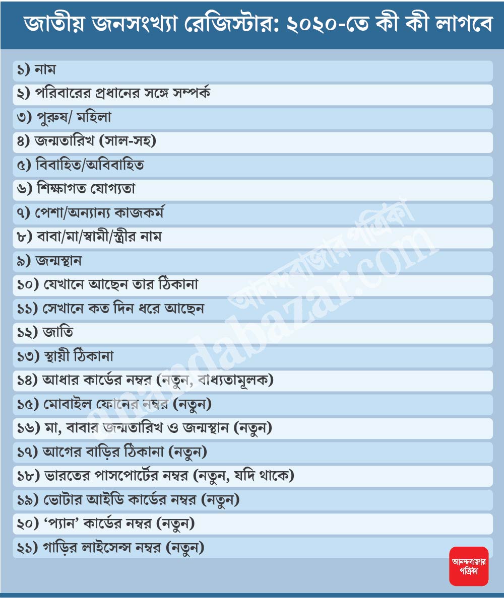 তবে এ বার এনপিআর-এ নাম নথিভুক্ত করাতে আগে যে বাড়িতে থাকতেন, সেই ঠিকানাও পুরো লিখতে হবে। প্রমাণ-সহ। সঙ্গে লিখতে হবে নাম, পরিবারের প্রধানের সঙ্গে আপনার সম্পর্ক, পুরুষ না মহিলা, জন্মতারিখ, জন্মস্থান। জানাতে হবে আপনি বিবাহিত না অবিবাহিত, আপনার শিক্ষাগত যোগ্যতা কী, পেশা/অন্যান্য কাজকর্ম কী, যেখানে আছেন তার ঠিকানা, সেখানে কত দিন ধরে আছেন, জাতি ও আপনার স্থায়ী ঠিকানা।