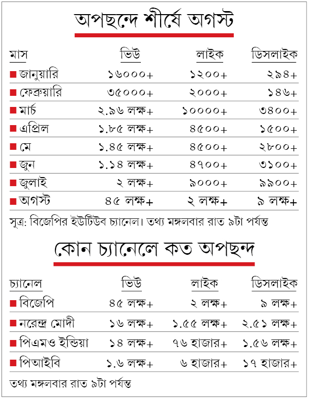 রবিবার দুপুরে বিজেপি, নরেন্দ্র মোদী, পিএমও ইন্ডিয়া, পিআইবি— এই চারটি ইউটিউব চ্যানেলেই আপলোড করা হয় বক্তৃতা। সবক’টি চ্যানেলেই দেখা যায় একই প্রবণতা। অপছন্দের রেশ গিয়ে পড়ে প্রধানমন্ত্রীর আগের ‘মন কি বাত’-এর ভিডিয়োগুলিতেও। সেগুলিতেও বাড়ে ‘ডিসলাইক’।