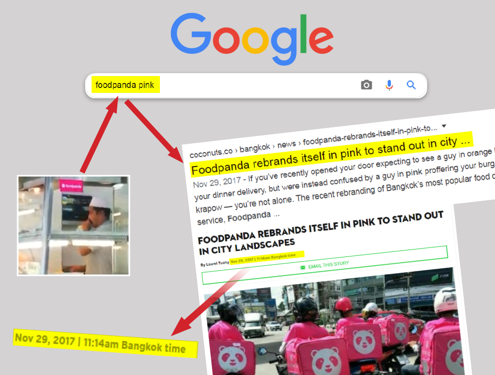 ভিডিয়োটি ভাল করে লক্ষ্য করলে দেখবেন ফুডপান্ডার লোগোটি গোলাপি রঙের। ভারতের ফুডপান্ডার লোগো কমলা। রঙের এর পার্থক্য দেখে আমরা ‘FoodPanda Pink’ লিখে গুগ্ল সার্চ করি এবং ব্যাঙ্ককের একটি নিউজ পোর্টালের প্রতিবেদন থেকে জানতে পারি ফুডপান্ডার এই লোগো দক্ষিণ পূর্ব এশিয়ায় ব্যবহার করা হয়। ফলে ভিডিয়োটি যে ভারতে তোলা নয়, তা এখানে থেকেই নিশ্চিত হওয়া যায়।
