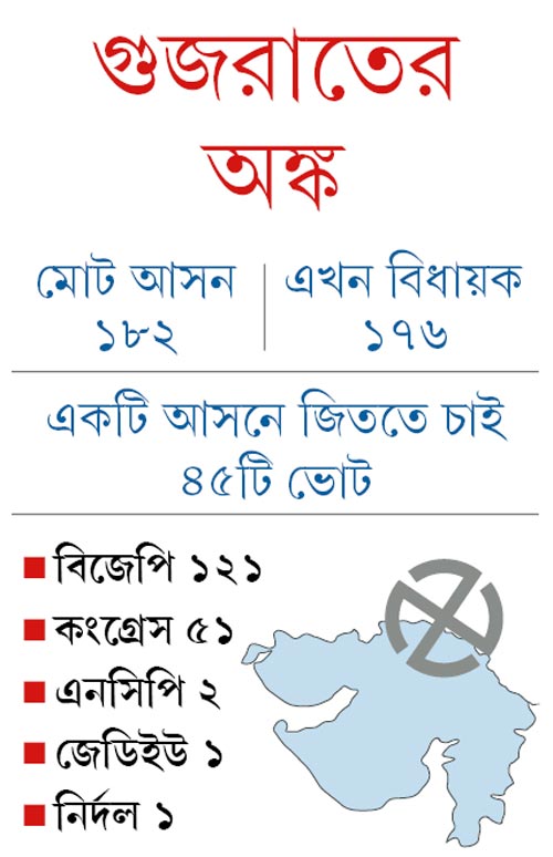 সুপ্রিম কোর্টের নির্দেশের পরে নতুন করে অঙ্ক কষা শুরু করেছে বিজেপি। গুজরাত বিধানসভায় আসন সংখ্যা ১৮২। ছয় কংগ্রেস বিধায়ক পদত্যাগের পরে ভোট দেবেন ১৭৬ জন। তার মধ্যে বিজেপির ১২১ জন, কংগ্রেসের ৫১ জন, এনসিপি-র ২, জেডিইউ-এর ১ ও নির্দল ১ জন।