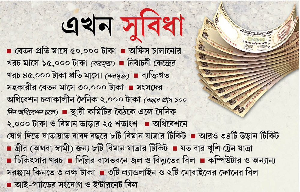 এখন কী কী সুযোগ-সুবিধা পান সাংসদরা? সূত্রের খবর, মাসে ৫০ হাজার টাকা বেতন পান তাঁরা। সঙ্গে অফিস চালানোর খরচ ও নির্বাচনী কেন্দ্রে কাজের ভাতা বাবদ আরও ৬০ হাজার টাকা। এই ৬০ হাজার টাকা পুরোপুরি আয়কর-মুক্ত। অর্থাৎ মাসে অঙ্কটা পৌঁছয় ১ লক্ষ ১০ হাজারে। সঙ্গে আরও নানা সুযোগ-সুবিধা! সাংসদরা কিন্তু বলছেন, বেতনটা খুবই কম। ২০০৯-এর পরে বেতন বাড়েনি। অথচ মূল্যবৃদ্ধি সীমা ছাড়িয়েছে। সরকারি কর্মীদের মহার্ঘ ভাতা দফায় দফায় বেড়েছে। কিন্তু সাংসদদের ‘স্যালারি-স্লিপ’ সেই আগের মতোই!