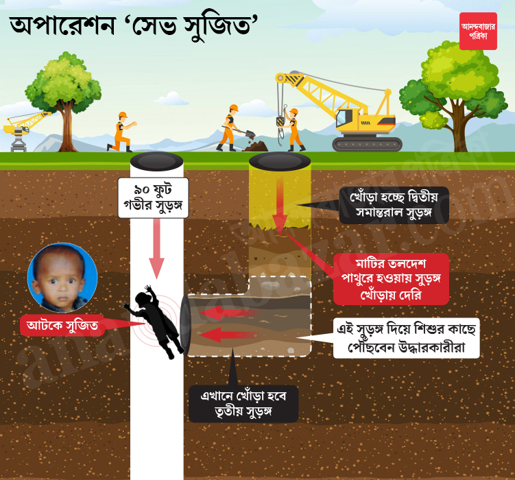 প্রথম দিকে অবশ্য হাতে দড়ির ফাঁস লাগিয়ে, কাপড়ের থলিতে নীচে ফেলে, সাকশন পদ্ধতি প্রয়োগ করে উপরে তুলে আনার চেষ্টা করেন উদ্ধারকারীরা। ওই গর্তের পাশে পুরো এলাকা খুঁড়েও গভীরে পৌঁছনোর চেষ্টা করা হয়। কিন্তু ওই ভাবে খুঁড়ে ৯০ ফুট নীচে পৌঁছনো অসম্ভব বুঝেই শেষ পর্যন্ত ওই সুড়ঙ্গের পাশে সমান্তরাল একটি সুড়ঙ্গ খোঁড়ার সিদ্ধান্ত হয়। সেই কাজ চলছে। একই সঙ্গে শিশুটিকে সুস্থ রাখার জন্য খাবার, অক্সিজেনও পাঠানো হয়েছে ওই সুড়ঙ্গ দিয়ে।