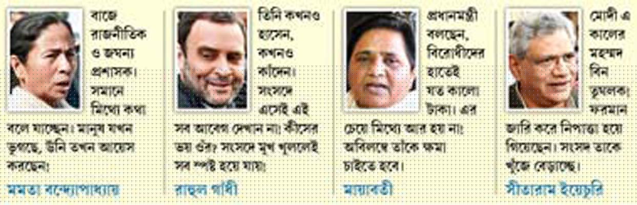 সংসদে এসে এই সব আবেগ দেখান না! কীসের ভয় ওঁর? সংসদে মুখ খুললেই সব স্পষ্ট হয়ে যায়!’’ আর মমতা বন্দ্যোপাধ্যায় বলেন, ‘‘বাজে রাজনীতিক ও জঘন্য প্রশাসক! সমানে মিথ্যে কথা বলে যাচ্ছেন! মানুষ যখন ভুগছে, উনি তখন আয়েস করছেন!’’