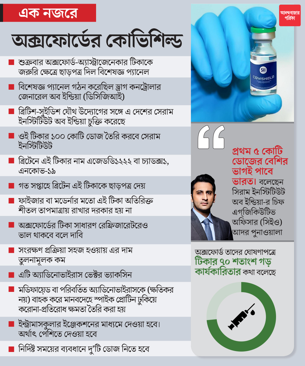 অক্সফোর্ডের করোনা টিকা ভারতে তৈরি করছে সেরাম ইনস্টিটিউট। সেই টিকাকেই সরকারি বিশেষজ্ঞ কমিটির পক্ষ থেকে ছাড়পত্র দেওয়া হল। এরপর এটিকে ওষুধ নিয়ন্ত্রক সংস্থা, ‘ড্রাগ কন্ট্রোলার জেনারেল অব ইন্ডিয়া’-র কাছে পাঠানো হবে।