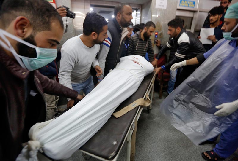 মৃত পুলিশকর্মীর দেহ ঘিরে চিকিৎসক এবং হাসপাতালের কর্মীরা। ছবি: রয়টার্স।