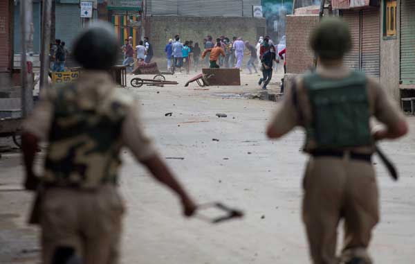শ্রীনগরে জনতা-পুলিশ সংঘর্ষ। ছবি: এপি।