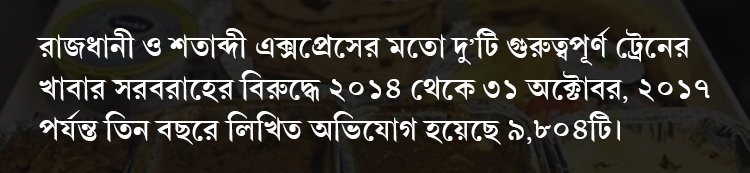 ট্রেনের খাবারের গুণগত মান নিয়ে কম্পট্রোলার অ্যান্ড অডিটর জেনারেল (ক্যাগ) সংসদে যে রিপোর্ট কিছুকাল আগে পেশ করেন, তাতে স্পষ্ট লেখা আছে রেলের পরিবেশিত খাবার উপযুক্ত মানের নয়।