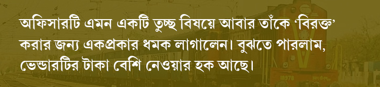 আর একটি অভিজ্ঞতার কথা না বললে সম্পূর্ণ হবে না। শিয়ালদহ স্টেশনে একটি খাবার বিক্রির স্টলে যে দাম লেখা থাকে, তার থেকে প্রতিটি খাবারের জিনিসের দাম ১০ টাকা নিয়মিত বেশি চাওয়া হয়। লিখিত দামের কথা বললে হয় উত্তর পাওয়া যায়, ‘ওটা পুরনো তালিকা’ অথবা বলা হয়, ‘এটা স্পেশাল কোয়ালিটি।’ কয়েক বার এ রকম হওয়াতে রেলের শিয়ালদহ বিভাগের বাণিজ্য বিভাগের প্রধানকে ফোন করে বিষয়টা জানালাম। বললেন, দেখবেন। মাস দু’য়েক পরে দেখলাম, সেই ট্র্যাডিশন সমানে চলছে। আবার ফোন করলাম। এ বার অফিসারটি এমন একটি তুচ্ছ বিষয়ে আবার তাঁকে ‘বিরক্ত’ করার জন্য একপ্রকার প্রায় ধমক লাগালেন। বুঝতে পারলাম, ভেন্ডারটির টাকা বেশি নেওয়ার হক আছে।