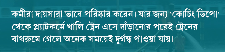 পরিচ্ছন্নতা নিয়ে বলতে গেলেও দু’পক্ষের কথা বলতে হয়। কর্মীরা দায়সারা ভাবে পরিষ্কার করেন। যার জন্য ‘কোচিং ডিপো’ থেকে প্ল্যাটফর্মে খালি ট্রেন এসে দাঁড়ানোর পরেই ট্রেনের বাথরুমে গেলে অনেক সময়েই দুর্গন্ধ পাওয়া যায়। মাঝপথে ট্রেন স্টেশনে দাঁড়ালে, সাফাইওয়ালা অল্প কিছু সংখ্যক কামরা কোনও রকমে পরিষ্কার করেই পালিয়ে যায়। যাত্রীরাও অন্য যাত্রীর কথা ভাবেন না। কামরার ভেতরেও একই অবস্থা। চলন্ত ট্রেনে না হয় ঠিকমতো পরিষ্কার, না আসে যাত্রীদের চেতনা।