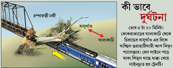 ঝড়ে উপড়ে রেললাইনে পড়েছিল বিশাল এক শিমুল গাছ। মেঘলা ভোরের অল্প আলোয় তা বুঝে উঠতে সময় লেগে গিয়েছিল ট্রেন চালকদের। বিপদ বুঝে যতক্ষণে তাঁরা ব্রেক কষেন, ততক্ষণে গাছে ধাক্কা মেরে সেতুর রেলিং ভেঙে নদীর উপরে ঝুলে পড়ে ইঞ্জিন। লাইনচ্যুত হয় আলিপুরদুয়ার থেকে গুয়াহাটিগামী আপ সিফুং প্যাসেঞ্জারের পাঁচটি কামরা। একটি কামরা আবার অন্য কামরার ঘাড়ে উঠে যায়। ট্রেনের দুই চালক এবং ১৬ জন যাত্রী আহত হয়েছেন এই দুর্ঘটনায়।