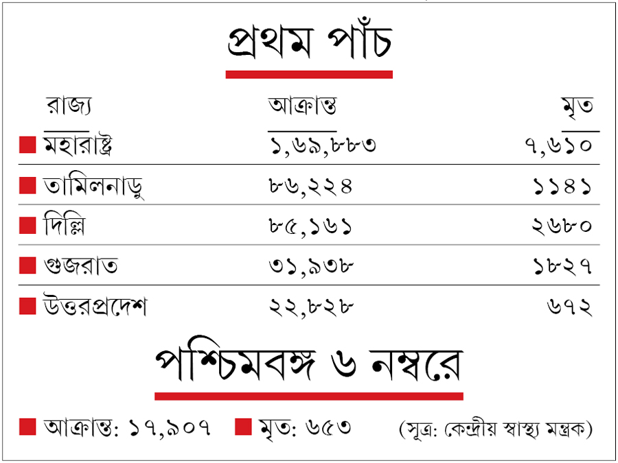 স্বাস্থ্য মন্ত্রক জানিয়েছে, দেশে অ্যাক্টিভ রোগী এখন ২,১৫,১২৫ জন। সুস্থের সংখ্যা ৩,৩৪,৮২১ জন। আরোগ্যের হার বেড়ে ৫৯.০৭ শতাশ। মোদীও দাবি করেন, লকডাউনের ফলে অন্যান্য দেশের থেকে ভাল অবস্থায় রয়েছে ভারত। রাজ্যগুলির মধ্যে মোট রোগীর সংখ্যার নিরিখে দিল্লিকে টপকে আজ আবার দু’নম্বরে তামিলনাড়ু। দক্ষিণী রাজ্যে গত কাল থেকে ৪ হাজারেরও বেশি নতুন সংক্রমণ ধরা পড়েছে। মহারাষ্ট্রে সেই সংখ্যাটা ৫২০০-র বেশি। এক দিনে ১১০০-র বেশি সংক্রমণে অন্ধ্র-হরিয়ানাকে ছাপিয়ে গিয়েছে কর্নাটক। সরকারি সূত্রের দাবি, এখন রোজ ২ লক্ষেরও বেশি নমুনা পরীক্ষা হচ্ছে।