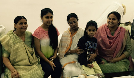 মমতাই নীতীশকে শপথগ্রহণের পর চা-চক্র আয়োজনের কথা বলেছিলেন। চা-চক্রের জন্য এক নম্বর অ্যানে মার্গে নীতীশের বাড়ির লন সুন্দর করে সাজানো হয়েছিল। ছিল আমিষ-নিরামিষ সব ধরনের খাবারই। লালু বললেন, এই বাড়ির তাঁর সবকিছুই চেনা। তিনি এখানে ১৫ বছর কাটিয়েছেন। চা-চক্রের পর নীতীশের বাড়ি থেকে ফের হেঁটে হেঁটেই দশ নম্বর সার্কুলার রোডে লালু-রাবড়ীর বাড়িতে চলে যান। সঙ্গে রাজ্যের মন্ত্রী ফিরহাদ হাকিম। লালু-রাবড়ী, লালুর দুই ছেলে তেজস্বী-তেজপ্রতাপ তো আছেনই। লালু-রাবড়ীর বাড়িতেও তাঁদের ছেলে-মেয়ে, নাতি-নাতনিদের মধ্যে মমতাকে নিয়ে হুল্লোড় চলল। মমতাকে মাঝখানে বসিয়ে সকলে ছবিও তুললেন।