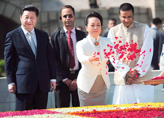 রাজঘাটে গাঁধীর সমাধিস্থলে শ্রদ্ধা জানাচ্ছেন চিনের ‘ফার্স্ট লেডি’।
