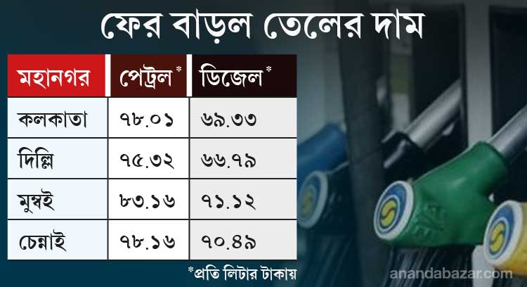 ফের বাড়লপেট্রল-ডিজেলের দাম। কর্নাটকের ভোট মেটার পর এই নিয়ে দু’বার। বৃহস্পতিবার সকাল থেকে নতুন যে দাম কার্যকর হয়েছে, তাতে জ্বালানি তেলের দাম অনেকটাই বাড়িয়ে দেওয়া হয়েছে। কলকাতায় পেট্রলের দাম বেড়ে হয়েছে ৭৮ টাকা ০১পয়সা। অর্থাত্, আগের চেয়ে ৫১ পয়সা বেশি। ডিজেলের দাম যতটা বাড়ানো হয়েছে, তাতে পরিবহণ শিল্পে ঘনাচ্ছে আশঙ্কার মেঘ। কলকাতায় গত সোমবার ডিজেলের দাম ছিল ৬৬ টাকা ১৮ পয়সা। আজ তা এক লাফে বেড়ে দাঁড়িয়েছে ৬৯ টাকা ৩৩ পয়সায়।