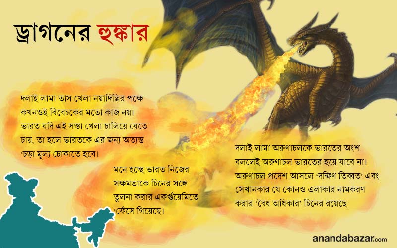 চিনের আসল আক্রোশ যে দলাই লামার অরুণাচল সফর নিয়ে, তাও ফের স্পষ্ট হয়ে গিয়েছে। গ্লোবাল টাইমসে লেখা হয়েছে, ‘‘চিন কেন এই সময়ে দক্ষিণ তিব্বতের ছ’টি এলাকার নতুন নামকরণ করল, ভারতের এখন তা গুরুত্ব দিয়ে ভেবে দেখা উচিত। দলাই লামা তাস খেলা নয়াদিল্লির পক্ষে কখনওই বিবেচকের মতো কাজ নয়। ভারত যদি এই সস্তা খেলা চালিয়ে যেতে চায়, তা হলে ভারতকে এর জন্য অত্যন্ত চড়া মূল্য চোকাতে হবে।’’