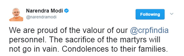 প্রধানমন্ত্রী এ দিন টুইটারে লিখেছেন, ‘‘ছত্তীসগঢ়ে সিআরপিএফ কর্মীদের উপর হামলা কাপুরুষোচিত এবং জঘন্য। আমরা পরিস্থিতির দিকে নিবিড় ভাবে নজর রাখছি।’’ প্রধানমন্ত্রী আরও লেখেন, ‘‘আমাদের সিআরপিএফ কর্মীদের বীরত্বে আমরা গর্বিত। শহিদদের এই আত্মত্যাগ বৃথা যাবে না। তাঁদের পরিবারের প্রতি সমবেদনা জানাই।’’