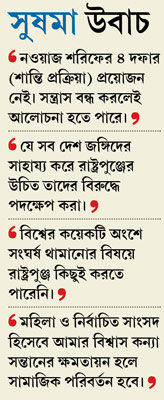 ভারতীয় সময় গত কাল মধ্যরাতে রাষ্ট্রপুঞ্জে পাক প্রধানমন্ত্রী নওয়াজ শরিফকে মোক্ষম জবাব দিয়েছিলেন বিদেশমন্ত্রী সুষমা স্বরাজ। রাষ্ট্রপুঞ্জে দাঁড়িয়ে পাকিস্তানকে সন্ত্রাস নিয়ে যেমন তুখোড় বাগ্মিতায় বিঁধেছেন সুষমা, তেমনই বিশ্বের বিভিন্ন বিষয়ে ভারতের দৃষ্টিকোণও তুলে ধরেছেন নিখুঁত ভাবে। আর সুষমার বক্তৃতা শেষ হওয়ার পরেই টুইটারে কার্যত ঝড় তুললেন নরেন্দ্র মোদী। বিদেশমন্ত্রীর বক্তৃতার ভূয়সী প্রশংসা করলেন প্রধানমন্ত্রী। বেনজির ভাবেই।
