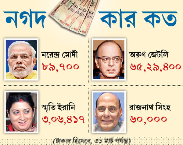প্রধানমন্ত্রী হওয়ার পর নরেন্দ্র মোদী মন্ত্রিসভার সব সদস্যকে নির্দেশ দিয়েছিলেন, ফি-বছর নিজেদের সম্পত্তির খতিয়ান দিতে। এ বছরের ৩১ মার্চ পর্যন্ত পেশ করা হিসেবে দেখা যাচ্ছে, খোদ প্রধানমন্ত্রীর হাতেই রয়েছে প্রায় ৯০ হাজার টাকা। নোট বদলের ঘোষণা প্রধানমন্ত্রীর হলেও গোটা কর্মকাণ্ডটি এখন যাঁকে রোজ সামলাতে হচ্ছে, তিনি অর্থমন্ত্রী অরুণ জেটলি। তাঁর হাতে নগদ রয়েছে প্রায় ৬৫ লক্ষ টাকা। তাঁর স্ত্রী সঙ্গীতার হাতে আরও প্রায় ৭ লক্ষ টাকা। তথ্য-সম্প্রচার মন্ত্রী বেঙ্কাইয়া নায়ডুর নিজের কাছে নগদ রয়েছে প্রায় ২৭ হাজার টাকা, কিন্তু স্ত্রীর হাতে দেড় লক্ষ টাকা। বিদেশমন্ত্রী সুষমা স্বরাজের কাছে নগদ প্রায় তিন লক্ষ টাকা রয়েছে। তবে গত আট মাসে এই হিসেবের হেরফের অবশ্যই হবে।