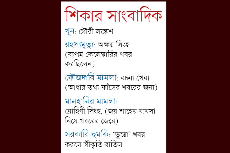 প্রধানমন্ত্রীর দফতর সূত্রে খবর, ভারতে সংবাদমাধ্যম কতটা ‘চাপমুক্ত হয়ে’ কাজ করে, তার উদাহরণ জোগাড়ে এখন ব্যস্ত অফিসারেরা। যা শুনে বিরোধীরা বলছেন, প্রধানমন্ত্রী হওয়ার পর থেকে একটিও সাংবাদিক বৈঠক করেননি মোদী। উল্টে ‘ভুয়ো খবর’ করলে সাংবাদিকদের সরকারি স্বীকৃতি বাতিলের শাস্তিমূলক আইন আনার সিদ্ধান্ত নিয়েছিল স্মৃতি ইরানির মন্ত্রক। এ ছাড়া, বিজেপি বা সরকারের পক্ষে অস্বস্তিকর খবর করলেই নিয়মিত মামলায় জড়িয়ে দেওয়া হয়েছে সাংবাদিকদের। অমিত শাহের ছেলে জয়ের সংস্থার ফুলে-ফেঁপে ওঠা নিয়ে খবর করার পরে একটি সংবাদ সংস্থার বিরুদ্ধে ১০০ কোটির মানহানির মামলা হয়েছে। সেই মামলা লড়ছেন অতিরিক্ত সলিসিটর জেনারেল।