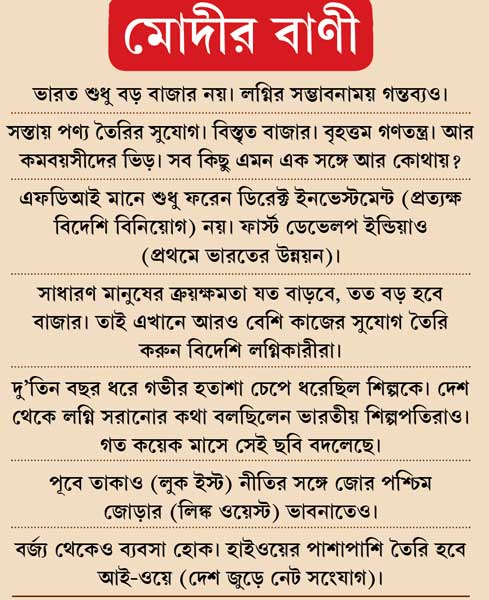 মোদীর দাবি, “গত দু’তিন বছরে অনেকে ভারত ছেড়ে চলে যেতে চাইছিলেন। গত তিন মাসে সেই মনোভাব বদলেছে।” কিছুটা শিল্পের মন পড়েই তাঁর সংযোজন, “হঠাৎ নীতি বদলালে, সিবিআই গেলে, বিশ্বাস হারিয়ে যায়। আমি আপনাদের কাছে তা-ই শুনেছি। এই ছবি বদলাতে চাই।” বিদেশি লগ্নির পিছনে ছুটতে গিয়ে তাঁর সরকার যে সাধারণ মানুষকে ভুলবে না, তা বোঝাতে গিয়ে তাঁর মন্তব্য, এফডিআই মানে ফার্স্ট ডেভেলপ ইন্ডিয়া-ও। তাঁর আশ্বাস, সমস্যা হলে, কেন্দ্র হস্তক্ষেপ করবে। কথা বলবে রাজ্য সরকারের সঙ্গে। জোর দেবে পরিকাঠামো তৈরির উপরেও। বিশ্ব ব্যাঙ্কের রিপোর্ট অনুযায়ী, লগ্নির পরিবেশের মাপকাঠিতে ভারত এখন বিশ্বে ১৩৪-তম। সেখান থেকে দেশকে প্রথম পঞ্চাশে টেনে তুলতে চান তিনি।