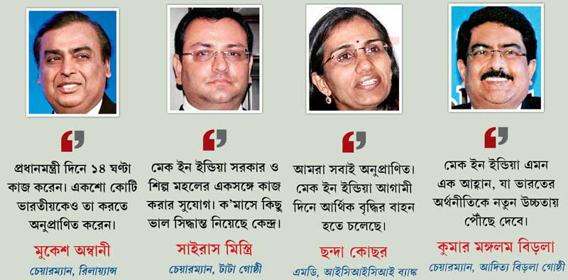 মোদী-জমানায় আস্থা যে ফিরছে, তা এ দিন খোলা গলায় স্বীকার করেছেন অম্বানী, মিস্ত্রি, প্রেমজি, বিড়লার মতো শিল্পপতিরা। এই লক্ষ্যে কেন্দ্রের পাশে থাকার প্রতিশ্রুতিও দিয়েছে শিল্পমহল। ঠিক যেমনটা এতদিন ‘ভাইব্র্যান্ট গুজরাত’ শিল্প সম্মেলনের মঞ্চে দেখা যেত। সকলেই মেনে নিয়েছেন, ভারতকে উৎপাদন শিল্পের গন্তব্য হিসেবে গড়ে তুলতে ‘মেক ইন ইন্ডিয়া’র কর্মসূচি একেবারে সঠিক পদক্ষেপ। মুকেশের দাবি, তাঁর গোষ্ঠী রিলায়্যান্স আগামী ১২ থেকে ১৫ মাসে লগ্নি করবে ১ লক্ষ ৮০ হাজার কোটি টাকা। তাতে তৈরি হবে বিপুল কাজের সুযোগও। প্রধানমন্ত্রীর জাপান সফরে যেতে না-পারলেও আমেরিকায় তিনি যাচ্ছেন।