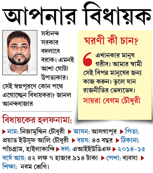 এখন বিধায়ক হিসেবে কী কী করতে চান? দীর্ঘ তালিকা তুলে ধরেন আলগাপুরের বিধায়ক। বললেন, ‘‘যখন প্রার্থী ছিলাম অনেক প্রতিশ্রুতি দিয়েছি। এখন বিধায়ক। তাই আমাকে সে সব প্রতিশ্রুতি রূপায়ণে কাজ করতে হবে।’’ তাঁর কথায়, এলাকার গরিব মানুষের পাশে থেকে কাজ করবেন তিনি। তাঁর কাছে এসে কোনও মানুষ যাতে নিরাশ হয়ে না ফেরেন, সে দিকে তীক্ষ নজর তাঁর। আলাগাপুরে সমস্যা অনেক। পানীয় জল, রাস্তাঘাট, হাসপাতাল, বিদ্যুৎ, বিদ্যালয়ের সমস্যা-সহ হাজারো মুশকিলের ঘেরাটোপে বন্দি এই বিধানসভা আসন। তাঁর কথায়, ‘‘আমাকে এই সব সমস্যার সমাধান করতে হবে। বিভিন্ন সময়ে সরকার পরিবর্তন হলেও এই এলাকায় কখনও পরিবর্তনের ছোঁয়া লাগেনি। গভীর অন্ধকারে ডুবে আছে এই অঞ্চলের বিস্তীর্ণ এলাকা।’’ সমস্ত সমস্যা কাটিয়ে উঠে আলগাপুর একদিন শহর হবে— এখন এই স্বপ্ন দেখেন নিজামুদ্দিন চৌধুরী।