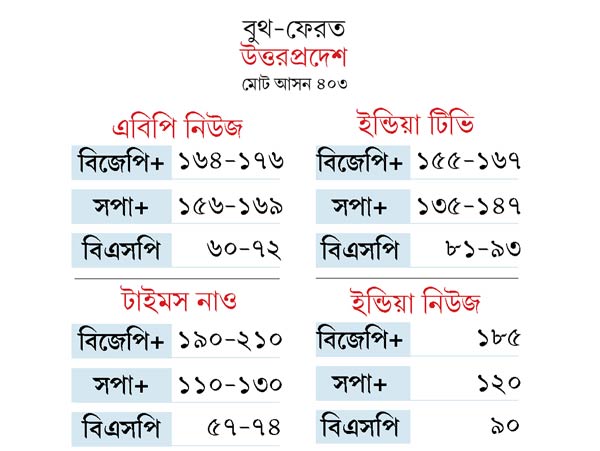 ভোট গণনা হতে আরও দু’দিন বাকি। তার আগেই তামাম বুথ-ফেরত সমীক্ষা আজ জানিয়ে দিল, উত্তরপ্রদেশে ‘অ্যাডভান্টেজ’ বিজেপি! এদের একাংশের মতে, হিন্দিবলয়ের বৃহত্তম এই রাজ্যে একার জোরেই সরকার গড়ে ফেলবেন মোদী-অমিত শাহরা। বাকিরা বলছেন, ফলাফল ত্রিশঙ্কু হতে পারে। তবে সে ক্ষেত্রেও সংখ্যাগরিষ্ঠ দল হবে বিজেপি। সরকার গড়ার দৌড়ে এগিয়ে থাকবে তারাই।