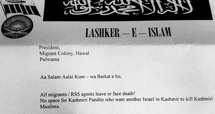 লস্কর-ই-ইসলামের লেটারহেডে টাইপ করা ওই পোস্টারগুলি দেখা গিয়েছে পুলওয়ামার সরকারি কর্মী আবাসনের কাছে। হুমকি পোস্টারে লেখা হয়েছে, সব পণ্ডিত এবং আরএসএস এজেন্টদের উপত্যকা ছেড়ে চলে যেতে হবে, না গেলে ফল ভুগতে হবে। পোস্টারে আরও লেখা হয়েছে, ‘‘এখানে কাশ্মীরি পণ্ডিতদের জন্য কোনও স্থান নেই, কারণ তারা কাশ্মীরি মুসলমানদের খুন করে কাশ্মীরকে আর একটা ইজরায়েলে পরিণত করতে চায়।’’