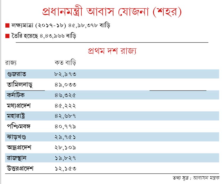 কেন্দ্রীয় সরকারের হিসেব বলছে, প্রধানমন্ত্রী আবাস যোজনায় এখন পর্যন্ত যত বাড়ি তৈরি হয়েছে, তার ৮০ শতাংশই ১০টি রাজ্যের দখলে রয়েছে। এই দশের মধ্যে উঠে এসেছে পশ্চিমবঙ্গ। ৮০ হাজারের বেশি বাড়ি বানিয়ে গুজরাত প্রথম। দ্বিতীয় ও তৃতীয় স্থানে রয়েছে তামিলনাড়ু ও কর্নাটক। তার পরে রয়েছে মহারাষ্ট্র ও মধ্যপ্রদেশ। মহারাষ্ট্রের সঙ্গে মাত্র দু’ হাজারের ফারাক পশ্চিমবঙ্গের। সব মিলিয়ে প্রধানমন্ত্রী আবাস যোজনায় শহরাঞ্চলে এ রাজ্যে ৪০ হাজারের বেশি বাড়ি তৈরি হয়েছে। এই প্রকল্পে কেন্দ্রের সহায়তা বাবদ রাজ্যে এসেছে ১৩৩৪ কোটি টাকার কাছাকাছি।