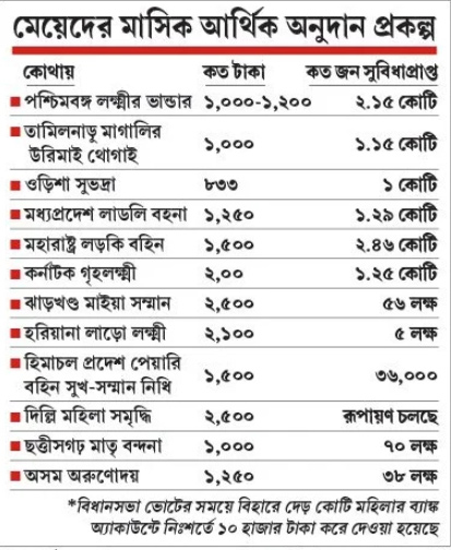 বিহারের আগে থেকেই দেশের ১২টি রাজ্যে মহিলাদের হাতে প্রতি মাসে নিঃশর্তে টাকা তুলে দেওয়ার প্রকল্প চলছে। এই তালিকায় রয়েছে বিজেপিশাসিত অসম, ছত্তীসগঢ়, মহারাষ্ট্র, মধ্যপ্রদেশ, দিল্লি, ওড়িশা, হরিয়ানার মতো রাজ্য। কংগ্রেসশাসিত হিমাচল, কর্নাটকও রয়েছে। পশ্চিমবঙ্গ, তামিলনাড়ু, ঝাড়খণ্ডের মতো আঞ্চলিক দলের নেতৃত্বাধীন রাজ্যও আছে। কোথাও মাসে এক হাজার টাকা, কোথাও আড়াই হাজার টাকা পর্যন্ত দেওয়া হচ্ছে। এর সঙ্গে বিহারে যে দেড় থেকে দু’কোটি মহিলা ১০ হাজার টাকা পেয়েছেন, তা জুড়লে আর্থিক অনুদানের সুবিধা পাওয়া মহিলাদের সংখ্যা ১২ কোটি ছাপিয়ে যাবে।