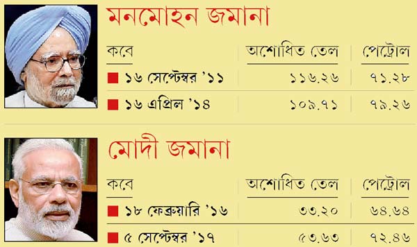 ইউপিএ আমলেও মন্ত্রীদের যুক্তি আর বিরোধীদের কটাক্ষের বয়ান ছিল বিলকুল এক। ২০১০ সালের ২৫ জুন তেলের দামের উপর থেকে সরকারি নিয়ন্ত্রণ উঠে যায়। তার পর তেলের দাম বাড়লেই মনমোহন সরকারের মন্ত্রীরা বলতেন, সরকারের হাতে আর কিছু নেই। আর পাল্টা সরব হতেন বিরোধীরা। ২০১২-র মে মাসে একবার পেট্রোলের দামবৃদ্ধির পর তদানীন্তন গুজরাতের মুখ্যমন্ত্রী নরেন্দ্র মোদী ট্যুইট করেছিলেন, ‘পেট্রোলের দাম বৃদ্ধি কংগ্রেসের ইউপিএ-সরকারের ব্যর্থতার নমুনা।’ ২০১১-এ আরেকবার পেট্রোলের দাম বাড়ার পর স্মৃতি ইরানি অভিযোগ তোলেন, ‘ইউপিএ সরকার মূল্যবৃদ্ধি নিয়ে মানুষের যন্ত্রণার কথা ভাবে না।’ অথচ মোদী সরকার ক্ষমতায় এসে ইউপিএ-র পথে হেঁটেই তেলে ভর্তুকি কমাতে পেট্রোলের মতো ডিজেলের দামেও সরকারি নিয়ন্ত্রণ তুলে নেয়।