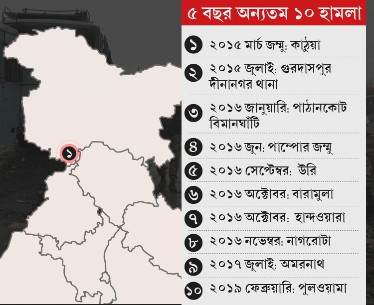 ২০১৪ থেকে ২০১৯— মোদী জমানার এই পাঁচ বছরে তীব্র হয়েছে জঙ্গি দমন অভিযান। কিন্তু তার সঙ্গেই তীব্রতর হয়েছে জঙ্গি নাশকতাও। জঙ্গি হামলায় বারে বারে রক্তাক্ত হয়েছে পাকিস্তান সীমান্ত লাগোয়া উত্তর-পশ্চিম ভারতের বিভিন্ন অংশ। অধিকাংশ ক্ষেত্রেই এই সব হামলার টার্গেট— নিরাপত্তা বাহিনী। প্রাণ গিয়েছে নিরীহ মানুষেরও। এই ধরনের ১০টি বড় হামলায় নিহত হয়েছেন অন্তত ৯৪ জন পুলিশকর্মী ও জওয়ান।