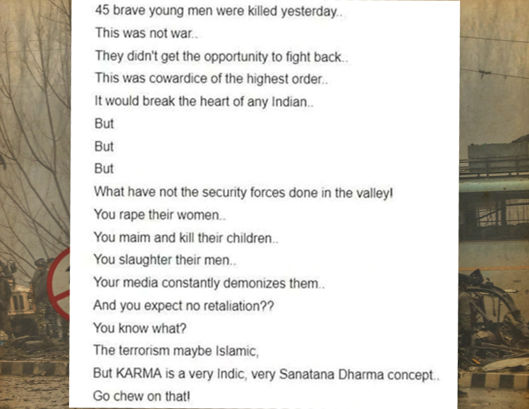 পাপড়ি লিখেছিলেন, “এই আক্রমণ কাপুরুষোচিত। কিন্তু কাশ্মীর উপত্যকায় ভারতীয় সেনা মহিলাদের ধর্ষণ করেছে, বাচ্চাদের খুন করেছে, পুরুষদের জবাই করেছে। দেশের সংবাদমাধ্যম নাগাড়ে সেখানকার লোকজনকে খলনায়ক সাজিয়েছে। কর্মফল ভোগ করতেই হবে।” পরে তিনি আরও লেখেন, “গো-মাতা ও রাম মন্দিরের বাইরে অন্য কোনও কিছু নিয়ে মাথা না ঘামানো সরকারের বিরাট গাফিলতির ফল এই জঙ্গি হানা। ওই হামলা প্রধানমন্ত্রীকে ক্ষমতার ফেরানোর জন্য আরএসএসের চক্রান্তও হতে পারে।”