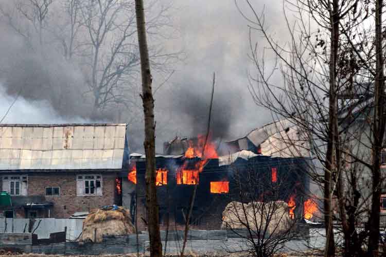 দাউদাউ: এখানে ঘাঁটি গেড়েছিল জঙ্গিরা। সেনার হামলায় জ্বলছে সেই বাড়ি। সোমবার পুলওয়ামায়। ছবি: এএফপি।