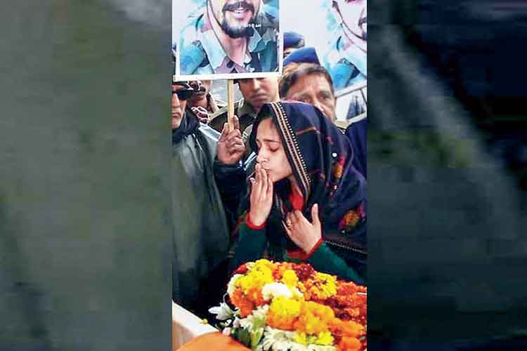 ভালবাসায়: পুলওয়ামায় জঙ্গি হানায় নিহত মেজর বিভূতিশঙ্কর ধুনদিয়ালের শেষকৃত্যে তাঁর স্ত্রী। মঙ্গলবার দেহরাদূনে। ছবি: পিটিআই