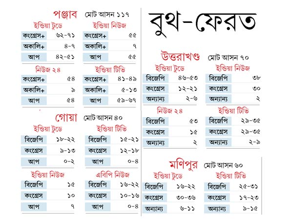 বুথ ফেরত সমীক্ষা সব সময় সঠিক হয়, এমন নয়। এর বৈজ্ঞানিক ভিত্তি নিয়েও প্রশ্ন রয়েছে। তবে আমজনতার ভোটদানের প্রবণতারও একটা হদিস মেলে। পাঁচ রাজ্যের সমীক্ষা অনুযায়ী, পঞ্জাবের পাশাপাশি উত্তরাখণ্ডেও পালাবদল ঘটছে। পাহাড়ি রাজ্যে এত দিন কংগ্রেস ক্ষমতায় ছিল। অধিকাংশ সমীক্ষার ভবিষ্যৎবাণী, বিজেপিই সেখানে সংখ্যাগরিষ্ঠতা পেতে চলেছে।