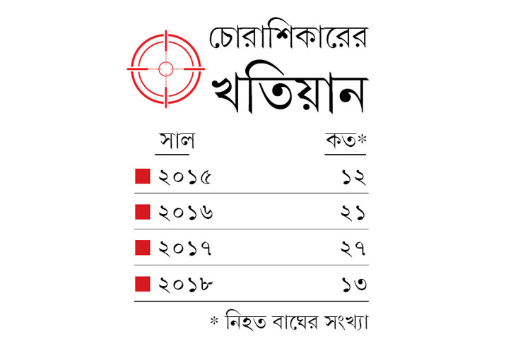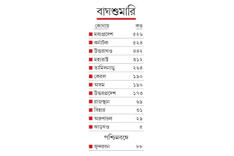 ন্যাশনাল টাইগার কনজ়ারভেশন অথরিটি (এনটিসিএ) বা জাতীয় বাঘ সংরক্ষণ কর্তৃপক্ষের তথ্য বলছে, ২০১৫ থেকে ২০১৮— এই চার বছরে দেশে মোট ৪২৩টি বাঘের মৃত্যু হয়েছে। যার মধ্যে আছে ৭৩টি চোরাশিকারের ঘটনা। এর বাইরে ৮৭টি মৃত্যুকে সন্দেহজনক আখ্যা দেওয়া হয়েছে। সেগুলি চোরাশিকার কি না, নিশ্চিত করে বলা যায়নি। এর মধ্যে সব থেকে কম চোরাশিকার হয়েছিল ২০১৫ সালে (১২টি)। সে-বার একটিও সন্দেহজনক মৃত্যুর ঘটনা ছিল না। ২০১৮ সালে ১৩টি চোরাশিকারের ঘটনা ঘটলেও সন্দেহজনক মৃত্যুর সংখ্যা ৫১। গত বছর এ রাজ্যের লালগড়ে একটি বাঘকে পিটিয়ে ও বল্লম দিয়ে খুঁচিয়ে মারা হয়েছিল। এই তথ্য দেখিয়েই অনেকের প্রশ্ন, সংখ্যা বাড়লেও বাঘের নিরাপত্তা বেড়েছে কি?