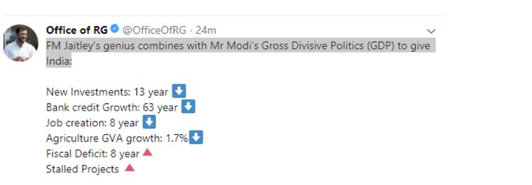 এ দিনের টুইটে রাহুল লিখেছেন, ‘‘কেন্দ্রীয় অর্থমন্ত্রী অরুণ জেটলির প্রতিভা আর প্রধানমন্ত্রী মোদীর আদ্যোপান্ত বিভাজনের রাজনীতির যোগেই ৬টি জিনিস হয়েছে।’’