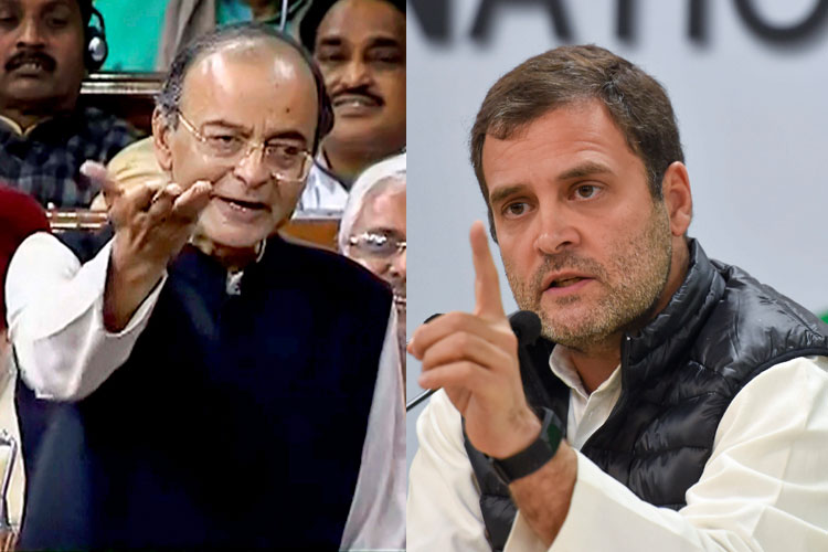লোকসভায় অরুণ জেটলি। সাংবাদিক বৈঠকে রাহুল গাঁধী (ডানদিকে)। ছবি: পিটিআই।