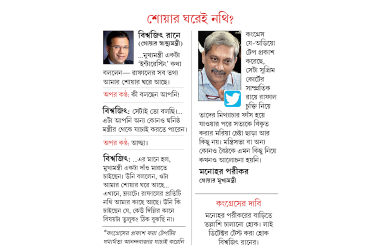 কী সেই টেপ? আজ সকালেই একটি অ়ডিয়ো টেপ প্রকাশ করেছে কংগ্রেস। তাদের দাবি, এটি গোয়ার স্বাস্থ্যমন্ত্রী বিশ্বজিৎ রানে এবং এক জন অজ্ঞাত পরিচয় ব্যক্তির টেলিফোন কথোপকথন। যাতে বিশ্বজিৎ বলছেন, মুখ্যমন্ত্রী তথা প্রাক্তন প্রতিরক্ষামন্ত্রী মনোহর পর্রীকর মন্ত্রিসভার বৈঠকে বলেছেন, তাঁর বেডরুমে রাফালের নথি রাখা আছে। এমন কথোপকথনের কথা অস্বীকার করেছেন পর্রীকর, রানে দু’জনেই। কিন্তু তাতে রাফাল-বিতর্কে লোকসভা তপ্ত হওয়া আটকায়নি।