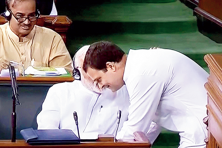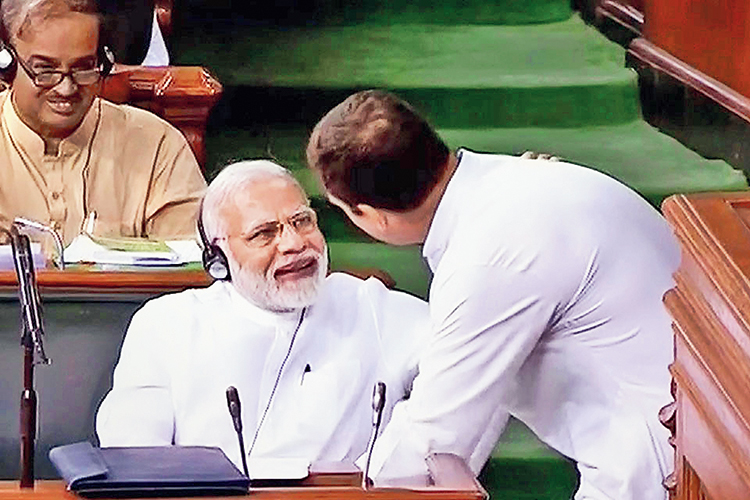 তার পরেই রাহুল বলেন, ‘‘আমি এক এক করে আপনাদের অন্তর থেকেও ভালবাসা বার করে আনব।’’ এ কথা বলেই নমস্কার জানিয়ে রাহুল সোজা প্রধানমন্ত্রীর আসনের দিকে হাঁটা দেন। কংগ্রেস সভাপতি শুধুই হাত মেলাবেন ভেবে মোদী হাত বাড়িয়ে দেন। কিন্তু রাহুল মোদীর সামনে গিয়ে তাঁকে উঠে দাঁড়াতে অনুরোধ করেন। মোদীর হাসি তখন উধাও। তিনি হাত উল্টে কারণ জানতে চাইছেন। মোদী বসে থাকায়, রাহুলই নিচু হয়ে আড়ষ্ট প্রধানমন্ত্রীর বুকে একেবারে মাথা রেখে তাঁকে জড়িয়ে ধরেন।