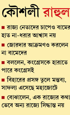 বামেদের হাত ধরার ব্যাপারে কেরলের কংগ্রেস নেতাদের যে আপত্তি আছে সেটা গত ১ ফেব্রুয়ারি অধীর চৌধুরীদের সঙ্গে বৈঠকেই স্পষ্ট করে দিয়েছিলেন রাহুল। একই সঙ্গে এ-ও বলেছিলেন, অন্য রাজ্যের কী বাধ্যবাধকতা, তা নিয়ে পশ্চিমবঙ্গের নেতাদের মাথা ঘামানোর দরকার নেই। সেই বৈঠকে হাজির প্রদেশ কংগ্রেস নেতা আব্দুল মান্নানের কথায়, ‘‘রাহুল গাঁধী আমাদের বলেন, এক একটি রাজ্যের রাজনৈতিক গতিশীলতা এক এক রকম। জাতীয় রাজনীতির জন্য বা কোনও একটি রাজ্যের জন্য অন্য রাজ্যকে আপস করতে বলব না।’’ সে দিন রাহুলের সঙ্গে কথা বলে জোটের ব্যাপারে আশাবাদী হয়েছিলেন প্রদেশ কংগ্রেস নেতারা। তবে তাঁরা তাকিয়ে ছিলেন রাহুলের কেরল সফরের দিকেও। সে রাজ্যে দলের সতীর্থদের আপত্তি তিনি কী ভাবে সামাল দেন সেটা দেখার জন্য।