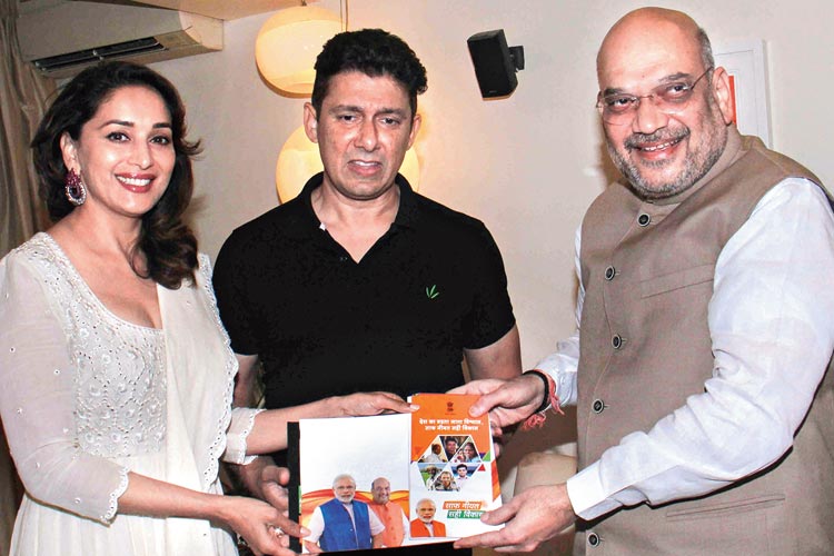 বুধবার অমিত শাহ জনসম্পর্ক স্থাপনে জুহুতে মাধুরীর বাড়িতে। সঙ্গে মুখ্যমন্ত্রী দেবেন্দ্র ফডণবীস ও বিজেপির কয়েক জন নেতা। ছবি: পিটিআই