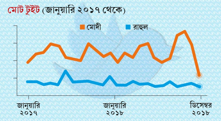 বিতর্কের বিষয়বস্তু হতে পারে। কিন্তু সামাজিক মাধ্যমের এই স্কোর যদি জনপ্রিয়তারমানদণ্ড হয়, তা হলে রাহুল গাঁধীর জনপ্রিয়তা বা গ্রহণযোগ্যতা বাড়ছে। ২০১৯-এ লোকসভার মহারণের আগে নেটযুদ্ধে অন্তত মোদীকে পিছনে ফেলেছেন রাহুল। রাহুলের বিরুদ্ধে ‘পাপ্পু’, ‘সাহাবজাদা’ কটাক্ষ বেশ কিছুদিন ধরেই কমেছে সোশ্যাল মিডিয়ায়। পাঁচ রাজ্যের বিধানসভা ভোটের সেমিফাইনালে ‘পাপ্পু পাস হো গ্যায়া’। বরং মোদীকে কটাক্ষ করেই মিম, জিফ, ভিডিয়োর ভিড় বেশি সোশ্যাল মিডিয়ায়। লোকসভা ভোটের ইভিএম-এও কি সোশ্যাল মিডিয়ার এই প্রবণতা ধরা পড়বে? উত্তর আপাতত সময়ের গর্ভে।