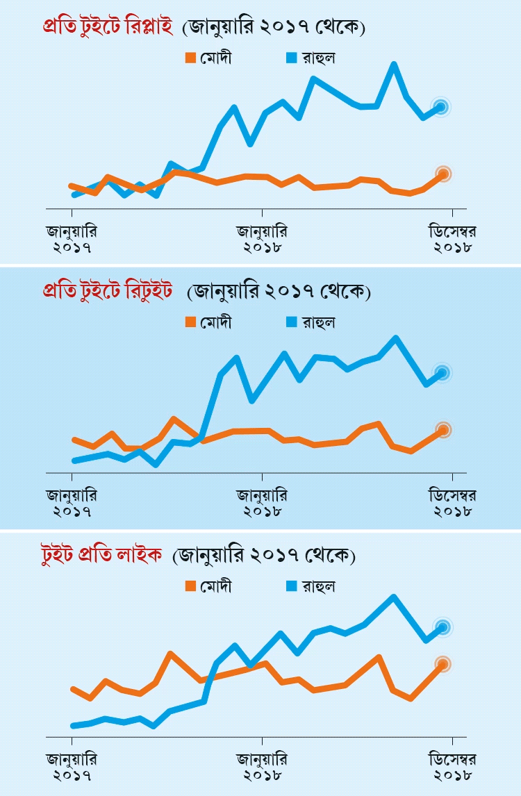 সোশ্যাল মিডিয়ায় এই অ্যাকটিভিটিকে বলা যেতে পারে ‘এনগেজমেন্ট’। এই ক্ষেত্রেই মোদীকে টেক্কা দিয়েছেন রাহুল। দু’জনের মধ্যে এই দু’বছরের এনগেজমেন্টের গ্রাফ করলে দেখা যাচ্ছে, রিপ্লাই, রিটুইট এবং লাইক— তিনটির চরিত্র প্রায় কাছাকাছি। ২০১৭-র শুরুতে রাহুলের গ্রাফ বেশ খানিকটা নীচে। কিন্তু সেটাই ওই বছরের অগস্ট-সেপ্টম্বরে মোদীকে টপকে গিয়েছেন রাহুল। তার পর সময় যত গড়িয়েছে, মোদীর চেয়ে রাহুলের টুইটের এনগেজমেন্ট উপরের দিকে উঠেছে। কমেছে মোদীর। এবং বাড়তে বাড়তে এখন সেই গ্রাফে মোদীর অনেক উপরে রাহুল গাঁধী। রিটুইটে যেমন মোদীর গ্রাফ গড়ে ২০০০ থেকে ২৫০০-র ঘরে। রাহুলের সেখানে ৬০০০ থেকে ৬৫০০-র মধ্যে। রিপ্লাইয়ে রাহুল ২৫০০ থেকে ৩০০০ এর মধ্যে, মোদী ৫০০ থেকে ১০০০। লাইক-এ মোদী ১০ থেকে ১৫ হাজারের মধ্যে, রাহুলের অবস্থা ২০ থেকে ২৫ হাজারে।