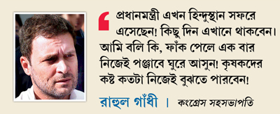 ট্রেনের সাধারণ কামরায় চেপে কাল পঞ্জাবে গিয়েছিলেন রাহুল। সেখানে বাজারে গিয়ে গমচাষিদের সঙ্গে কথা বলে আজ সকালে সটান সংসদে চলে আসেন। সেখানে কৃষকদের দুর্দশার প্রশ্নে মোদীর উদ্দেশে তীব্র কটাক্ষ ছুড়ে দিয়ে বলেন, ‘‘প্রধানমন্ত্রী এখন হিন্দুস্থান সফরে এসেছেন! কিছু দিন এখানে থাকবেন। আমি বলি কি, ফাঁক পেলে এক বার নিজেই পঞ্জাবে ঘুরেআসুন। কৃষকদের কষ্ট কতটা, নিজেই বুঝতে পারবেন!’’