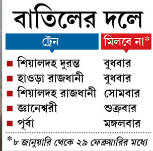 রেল জানাচ্ছে, কুয়াশায় দেখতে না-পেয়ে চালকেরা মাঝরাস্তাতেই ট্রেন দাঁড় করিয়ে দেন। আর একটা ট্রেন দাঁড়িয়ে গেলে তার পিছনে পরপর আটকে যায় অনেক ট্রেন। সড়কপথে যানজটের মতো রেলপথে তৈরি হয় ট্রেনের জট। সেই জট ছাড়িয়ে ট্রেনগুলির গন্তব্যে পৌঁছতে অনেক ক্ষেত্রে দ্বিগুণ সময় লেগে যায়। কিছু ট্রেন বাতিল করে লাইনে ট্রেনের সংখ্যা কমিয়ে দেওয়া হলে যে-সব ট্রেন চালু রাখার কথা, গতি ধীর হয়ে গেলেও সেগুলোকে একটানা চালানো সম্ভব হবে। ফলে মাঝপথে ঘণ্টার ঘণ্টা আটকে থেকে যাত্রীদের নাজেহাল হতে হবে না।